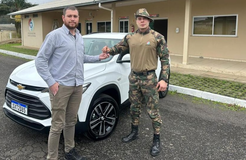 O veículo GM Tracker, ano 2025, zero quilômetro, entregue pelo representante do empreendimento energético situado na divisa dos municípios de Cerro Negro e Abdon Batista, integrará a frota da Polícia Ambiental para atividades administrativas e de fiscalização.