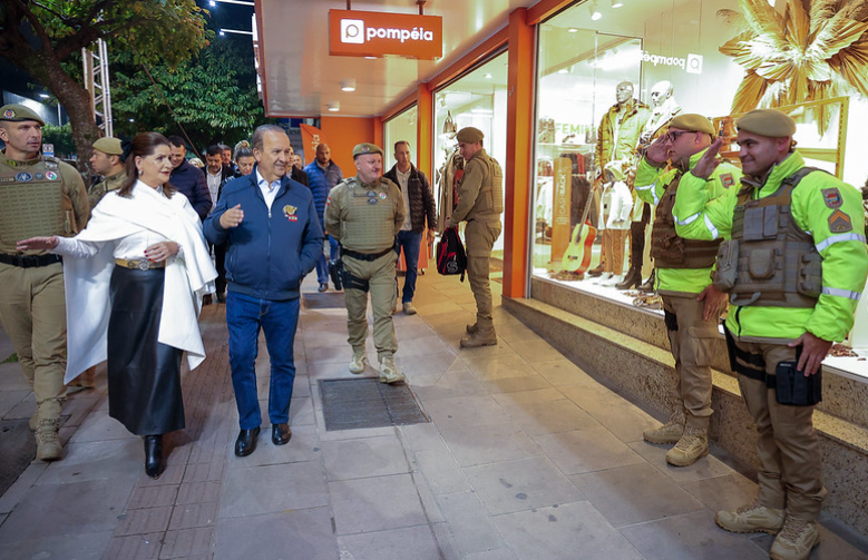 Governador Jorginho no caminho entre a prefeitura e o Calçadão em Lages interagindo com policiais militares cujo sistema de reconhecimento facil reforça a segurança durante a Festa do Pinhão