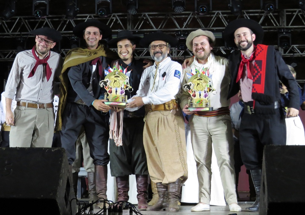 Carlos Eduardo de Liz, o Caco (de bota e bombacha) ajudando premiar Gabriel Jardim que fez de Sinuelos a grande campeã do Cante Uma Canção em Vacaria