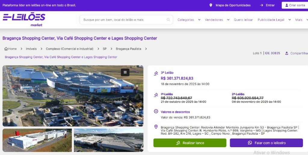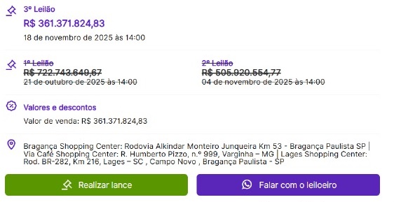 Significa que é preciso realizar três leilões e, ao final da terceira praça, o agente financiador (Bradesco), adjudica (assume), através de um de seus segmentos de negócio, o empreendimento. Não há, portanto, nenhuma crise instalada nos referidos shoppings, mas apenas se cumpre o rito legal, dentro daquilo já pensado, negociado e estabelecido quando do financiamento para a transferência do negócio.