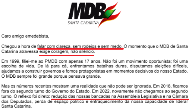 Faltando 100 dias para o término do prazo para homologação de candidaturas e coligações, duas movimentações envolvendo o MDB catarinense foram protagonizadas nesta última semana de abril. Na segunda-feira, 27, reuniram-se 56 prefeitos emedebistas e lideranças do MDB como os deputados Lunelli, Jerry Comper e Fernando Klelling com o governador Jorginho. O propósito foi evidenciar que parte das lideranças que tem mandato e voto, quer que o partido esteja com o atual govenrador no projeto de reeleição.