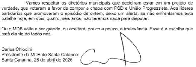Chiodini encerra observando que os diretórios municipais decidiram por estar em ‘um projeto de verdade’ com o PSD, PP e União Brasil e ainda faz alerta aos que lideraram a conversa da segunda-feira, 27, com o governador Jorginho.