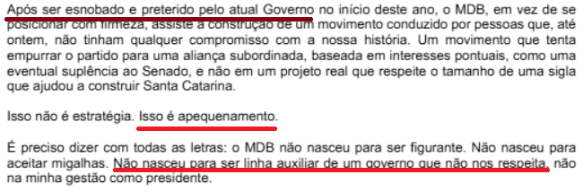 O presidente do MDB reclama de ter sido esnobado por Jorginho e que a adesão seria apequenamento da sigla e insiste que o atual governo não respeita a sigla