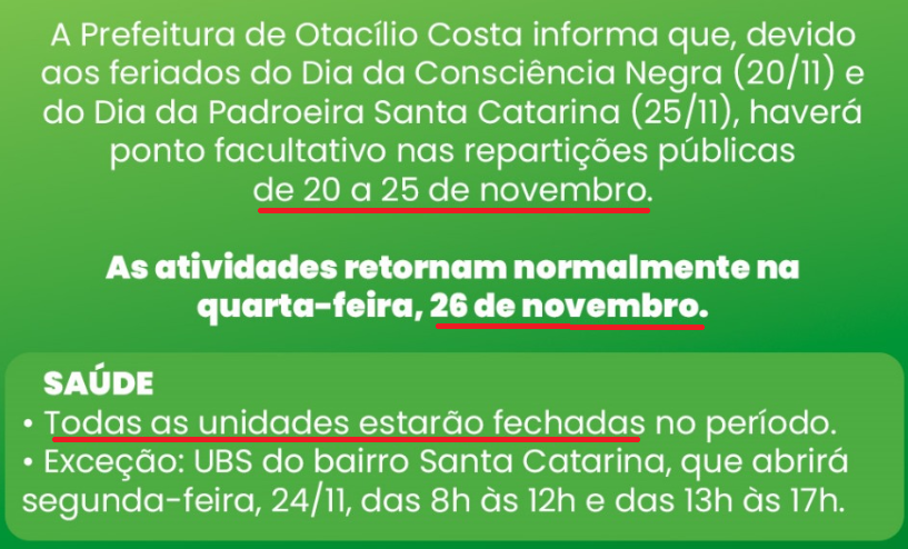 No contexto há coincidências e concessões do prefeito Fabiano Baldessar (MDB). Ocorre que a quinta-feira, 20, é feriado nacional (consciência negra) e a terça-feira, 25, é dia da padroeira de Otacílio Costa, Santa Catarina de Alexandria, por sinal, padroeira do Estado, mas sem feriado. Por conta disso, o prefeito Baldessar deu um canetaço estabelecendo ponto facultativo na sexta-feira, 21, e também na segunda-feira, 24. Daí a folga coletiva durante o período, mantendo-se apenas os serviços essenciais.