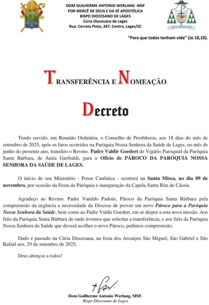 Por causa do envolvimento do padre anterior no noticiário policial (e antes fosse só nesse noticiário), os decretos que o Bispo Diocesano expede, geralmente na virada de ano, com nomeações e transferências, receberam uma exceção neste penúltimo dia de setembro. Dom Guilherme Werlang assinou a nomeação do novo pároco para a Igreja Nossa Senhora da Saúde do bairro Guarujá. Trata-se de Padre Valdir Goedert que estava em Anita Garibaldi, mas que possui longa atuação em Lages, inclusive na Catedral Diocesana.