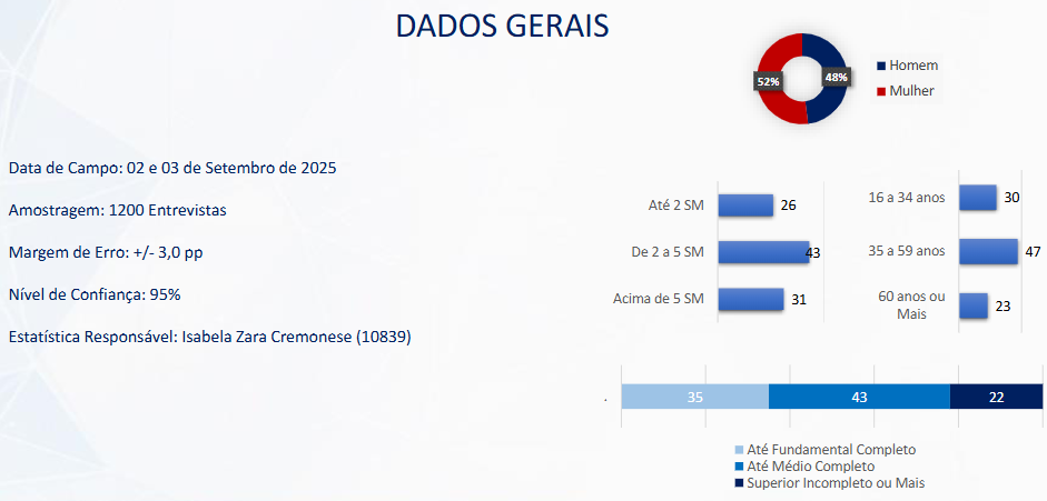 Os dados acima integram o levantamento realizado, lembrando que neste ano (2025), as pesquisas não precisam ser registradas na Justiça Eleitoral, diferente do ano eleitoral (2026) que esse tipo de levantamento somente pode ocorrer a partir do prévio registro.