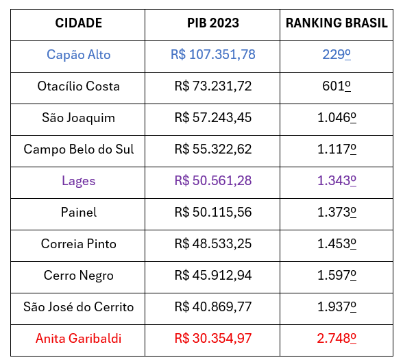 E se você pensar que é o investimento em geração de energia que garante a boa posição de Capão Alto no PIB per capita, observa-se que Anita Garibaldi tem mais empreendimentos do gênero e está numa posição lá embaixo.