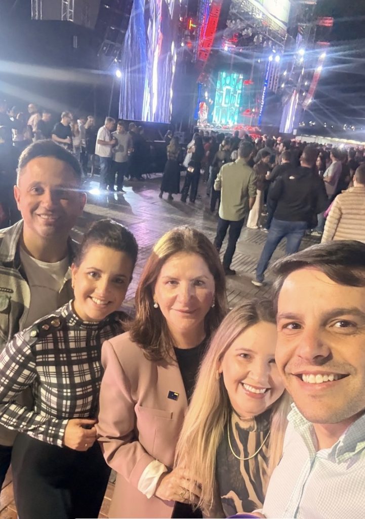 A prefeita Carmen Zanotto e os secretários Malek e Samuel Ramos e suas respectivas partners na área dos Very Important People na frente do palco montado virado para os lados do Paraguai.
