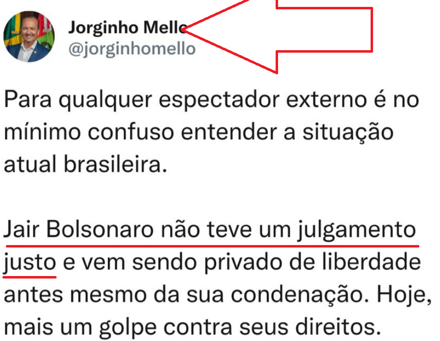 “A prisão do Presidente (sic!) Bolsonaro é um dos maiores absurdos já cometidos pela ‘justiça brasileira’. O maior líder que a direita já teve, homem que não cometeu crime algum, foi submetido a um processo absolutamente nulo, agora é levado a prisão”.