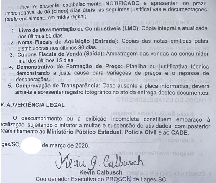 ÓRGÃO ENVIA EXPEDIENTE A REVENDEDORES (POSTOS) PEDINDO INFORMAÇÕES. TRATA-SE DE UMA AÇÃO ESTADUAL QUE INCLUI LAGES