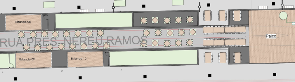 Além dos estandes, a rua Nereu Ramos (coberta) terá um palco para apresentações permanentes e cadeiras dispostas numa espécie de Praça de Alimentação ao público que visitar as entidades.