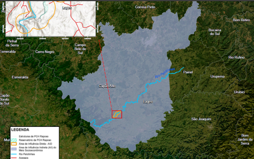 Acima, retiramos do relatório (que é público), o print sobre a localização do empreendimento, na Coxilha Rica. A PCH ficará bem acima da Usina Santo Cristo, que também utiliza potencial hidráulico do rio Pelotinhas (quase na chegada ao rio Pelotas).