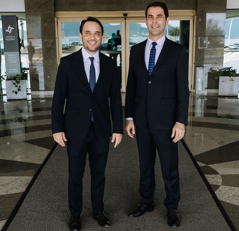 Juliano Mandelli e o diretor de Relacionamento com a Justiça Federal da OAB/SC, Jorge Mazera, na solenidade de instalação das novas Varas Federais. A mobilização exitosa da OAB/SC demonstrou que o Estado tinha menos unidades e 14,51% mais processos federais que o Rio Grande do Sul e 15,31% superior ao Paraná, e que mais de 46 mil processos daqui tramitavam em varas de outros Estados.